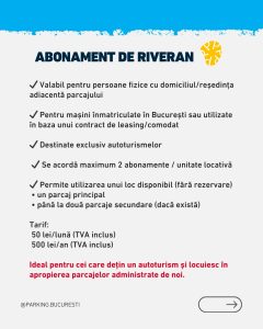 Șoferii din Capitală pot obține abonamente de riverani pentru acces la locurile disponibile din parcările publice cu plată, anunță Compania Municipală Parkin București. În acest caz, ei nu vor mai trebui să plătească zilnic acel tarif aferent parcărilor albastre din oraș.