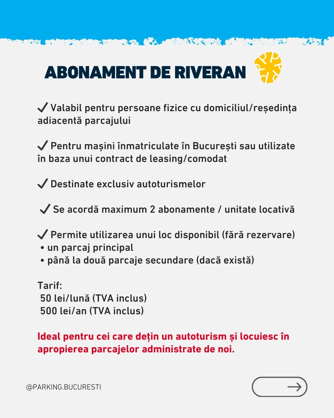 Șoferii din Capitală pot obține abonamente de riverani pentru acces la locurile disponibile din parcările publice cu plată, anunță Compania Municipală Parkin București. În acest caz, ei nu vor mai trebui să plătească zilnic acel tarif aferent parcărilor albastre din oraș.