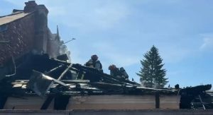 Focul se manifestă violent, cu degajări mari de fum, la nivelul acoperișurilor a două locuințe.